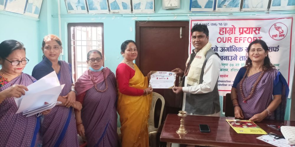 हाम्रो प्रयासद्वारा आयोजित सीपमूलक तालिम सम्पन्न, सहभागीलाई प्रमाण–पत्र वितरण विराटनगर। सामाजिक संस्था हाम्रो प्रयास, विराटनगर–७, मोरङको आयोजनामा नुहाउने अर्गानिक साबुन तथा सर्फ बनाउने तीनदिने तालिम कार्यक्रम सफलतापूर्वक सम्पन्न भएको छ। विराटनगर महानगरपालिका वडा नं. ८ को सहयोगमा