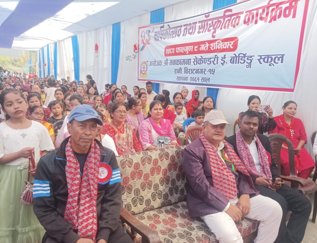 विराटनगर, फाल्गुण ९। श्री मनकामना सेकेण्डरी ई. बोर्डिङ्ग स्कूल, रानी–१५, विराटनगर ले आफ्नो २३औँ वार्षिकोत्सव तथा सांस्कृतिक कार्यक्रम शनिबार भव्य रूपमा सम्पन्न गरेको छ। २०६१ सालमा स्थापना भएको विद्यालयले शैक्षिक गुणस्तर, अनुशासन र अतिरिक्त क्रियाकलापलाई समान महत्व दिँदै आएको छ। क
