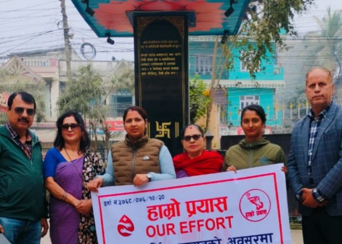 हाम्रो प्रयासको छैठौँ वार्षिक उत्सवमा रक्तदान कार्यक्रम सम्पन्न विराटनगर–७ स्थित सामाजिक संस्था हाम्रो प्रयासको छैठौँ वार्षिक उत्सवको अवसरमा रक्तदान कार्यक्रम सफलतापूर्वक सम्पन्न भएको छ। कार्यक्रम २०८२ माघ २१ गते विराटनगरको हाटखोलास्थित गिता मन्दिर परिसरमा आयोजना गरिएको थियो। कार