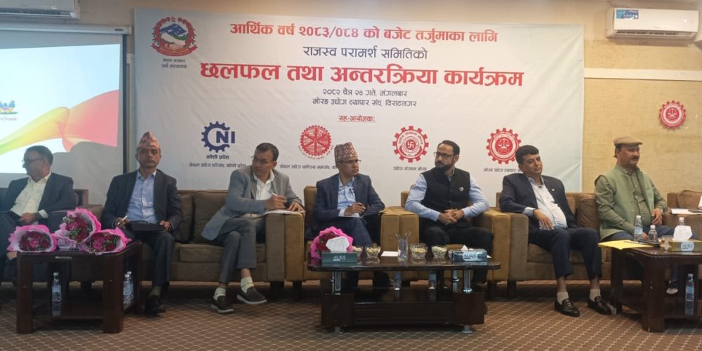 विराटनगरमा बजेट छलफल: निजी क्षेत्रको जोड—कर सुधार, लगानी सुरक्षा र नीतिगत स्थायित्व विराटनगर — आगामी आर्थिक वर्ष २०८३/०८४ को बजेट तर्जुमाका लागि अर्थ मन्त्रालय अन्तर्गतको राजश्व परामर्श समितिले मंगलबार विराटनगरमा आयोजना गरेको छलफल कार्यक्रममा निजी क्षेत्रले संस्थागत तथा व्यक्तिगत