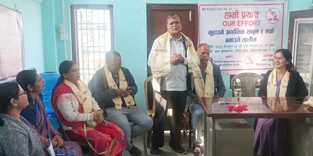 विराटनगर । सामाजिक संस्था हाम्रो प्रयास (Our Effort) र विराटनगर महानगरपालिका–८ को संयुक्त आयोजनामा नुहाउने अर्गानिक साबुन तथा सर्फ बनाउने सम्बन्धी तीनदिने तालिम कार्यक्रमको उद्घाटन गरिएको छ।